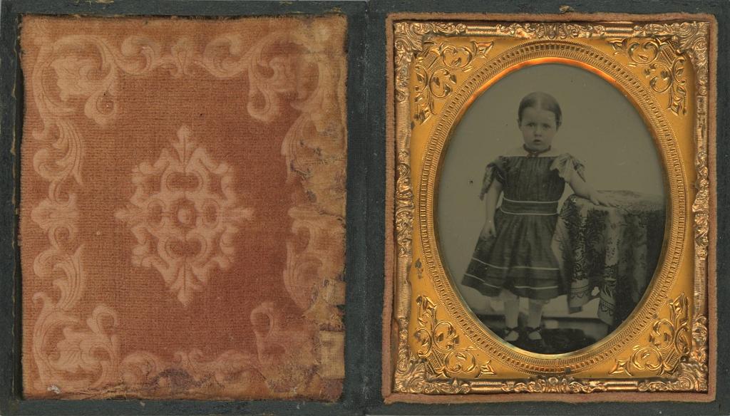 Little Girl Standing by Table 1/6 plate ambrotype of a little girl wearing an off