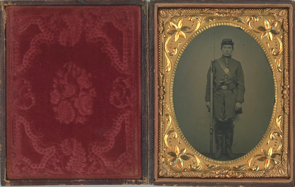 Triple Armed PrivateΒΌ plate tintype of a Union private standing with his musket and fixed bayonet. He has a pistol and a knife in his belt.