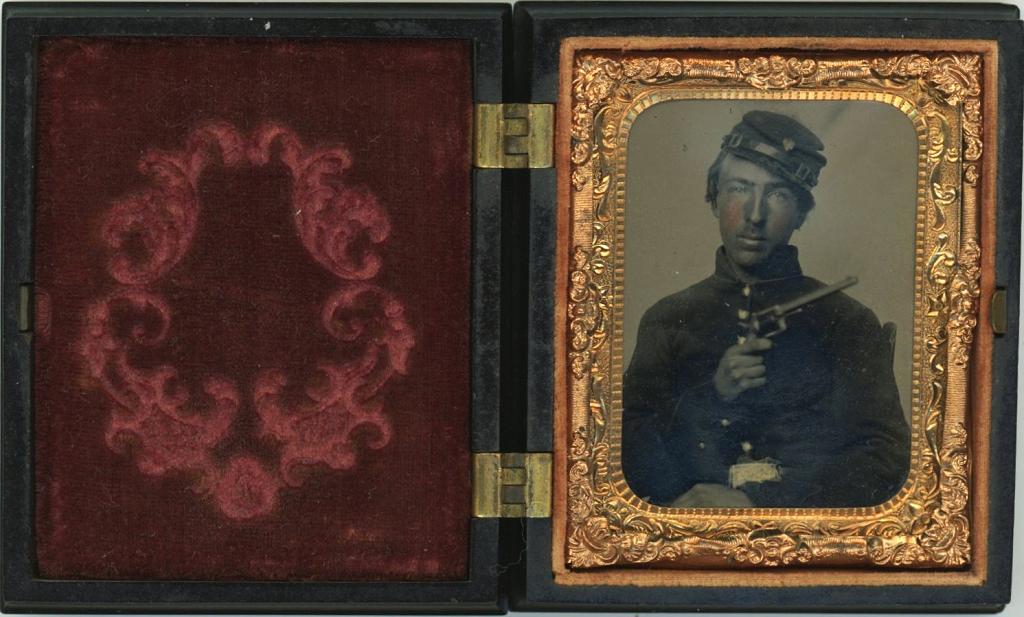 with Prescott Pistol1/9th plate tintype of a private with his hat at a Jaunty angle as