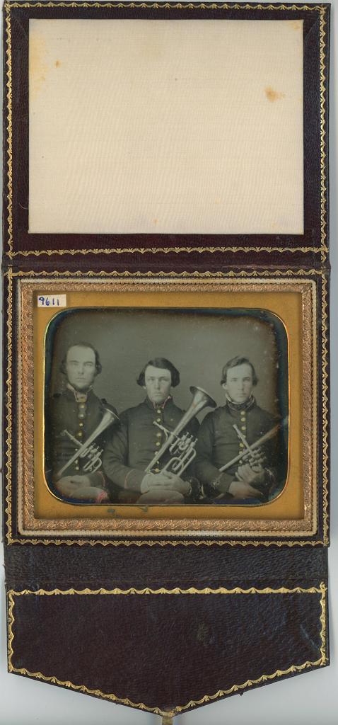 plate daguerreotype of a trio all holding upright saxhorns. All seem to have