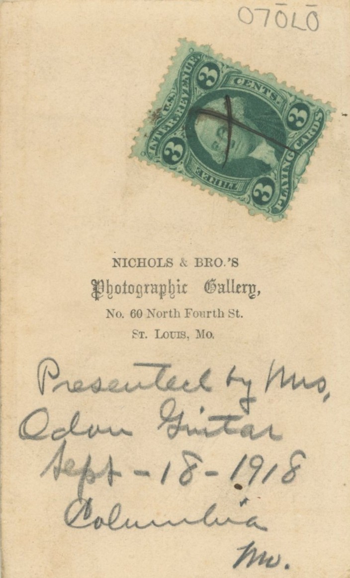 Missouri General Oden Guitar. A bust view CDV with Pencil presentation from Oden's wife dated Sept. 18th, 1918 on the reverse. Back marked Nichols & Bro’s St. Louis