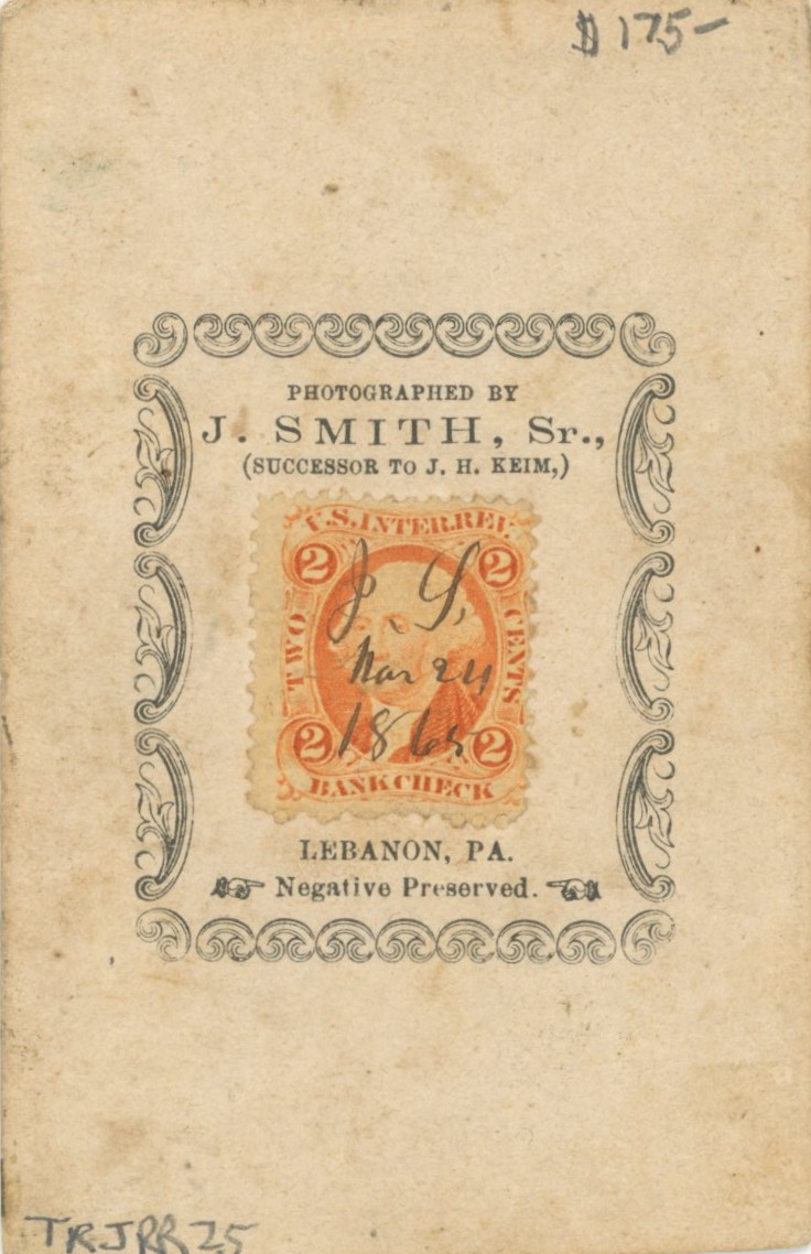 Armed Pennsylvania Private A full standing view of a private standing attention with this musket. Back marked. Smith, Lebanon, PA with orange two cent revenue stamp.